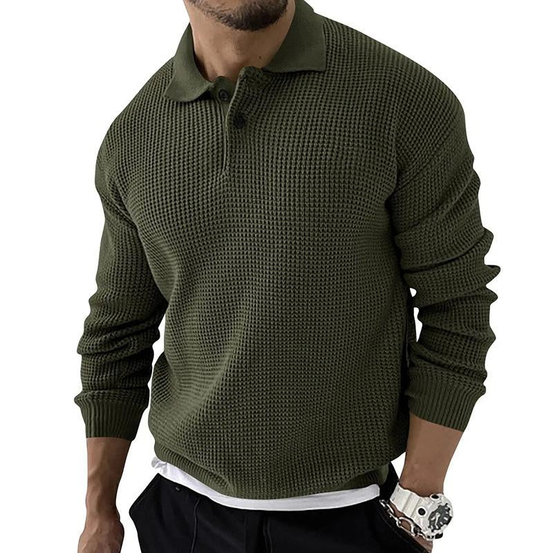 Confeccionado con material de punto de alta calidad, el suéter masculino de punto con solapa y botones es suave al tacto y cómodo de llevar. El diseño con tapeta de dos botones y ajuste ideal para superponer proporciona la máxima versatilidad. La estructura clásica de punto tipo gofre brinda un aspecto tradicional. Los hombros caídos le otorgan un estilo relajado y casual, además de crear una silueta suave sobre los hombros.